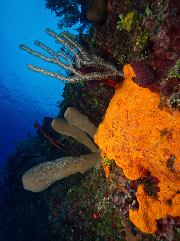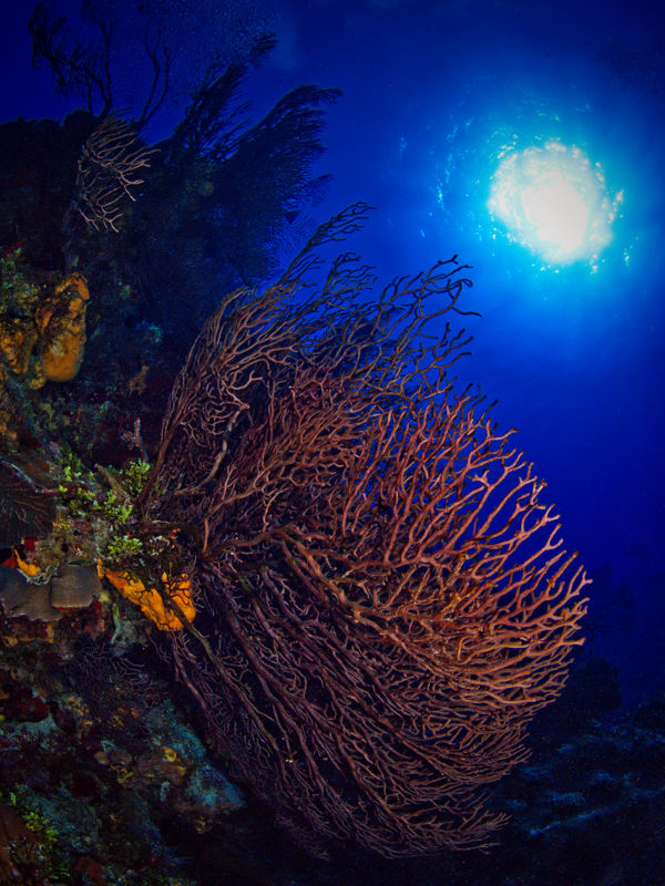 Most photographers hope to frame their subjects with deep, rich blues. You can achieve this in two ways. The first is to simply get deeper underwater where there is less available light. The second and more controllable way is to stop down. Since artificial light can only reach a short distance, your open water backgrounds will be exposed entirely by naturally available light. In general, this means f/11 will produce a darker background than f/5.6, for example.